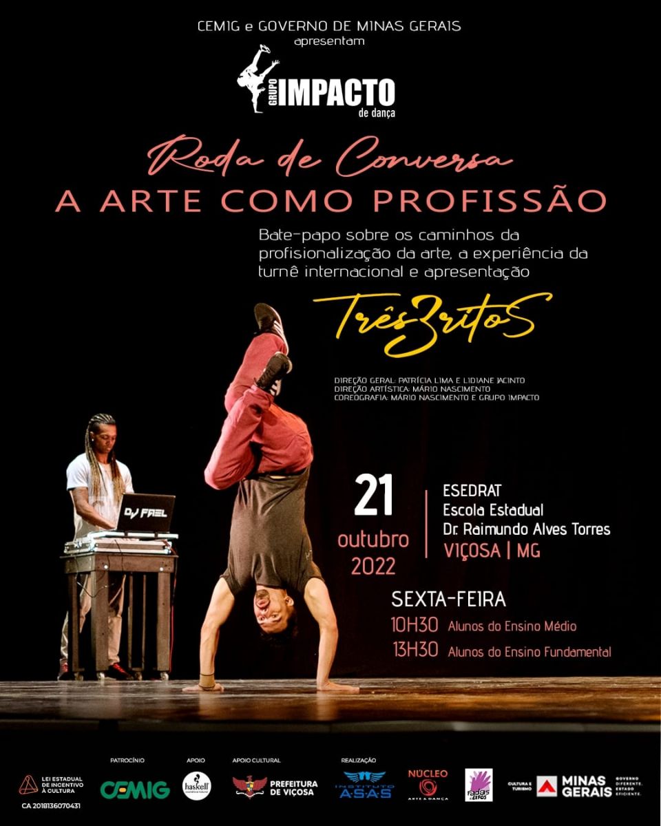 A roda de conversa promovida pelo Instituto ASAS e a turnê do Grupo Impacto de Dança acontecem por meio da Lei Estadual de incentivo à cultura de Minas Gerais, contando com o patrocínio master da CEMIG , apoio Haskell e Folha da Mata, apoio cultural PMV - Secretaria Municipal de Cultura, numa realização do Instituto ASAS, Núcleo de Arte e Dança , Fadas e Elfos.